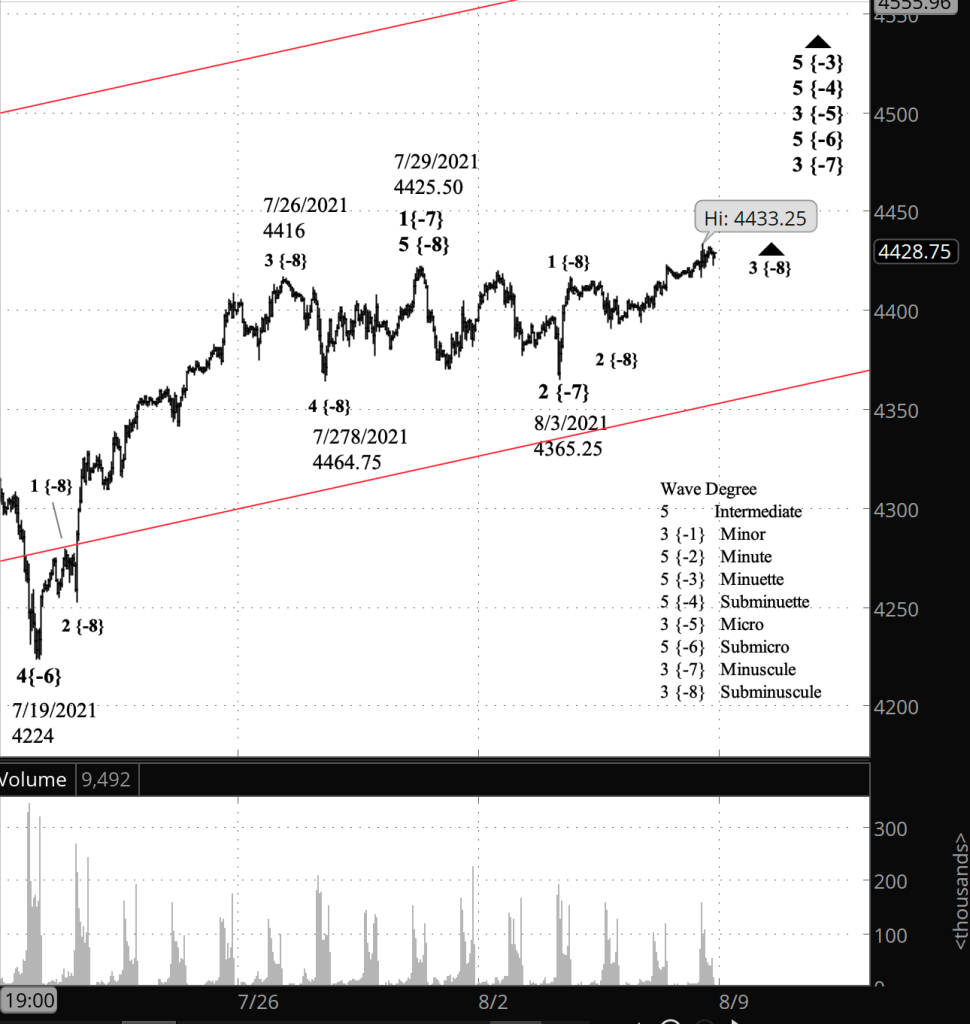 What’s happening now? The S&P 500 E-mini futures pushed higher in overnight trading, reaching 4433.25 shortly after the opening bell. The index shortly after the opening bell reached a new high of 4440.82, eliminating the divergence between the futures and the index described in yesterday’s post after the closing bell.