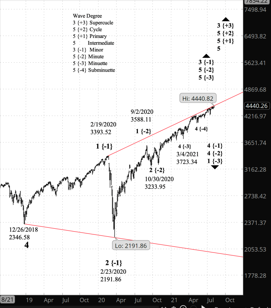 So, some targets. The upper boundary of the Minuette degree price channel is in the 4570s and rising. The longer it takes Subminuette 5 to reach the boundary, the higher the target high will be. Subminuette degree is three levels above Minuscule, so under the Elliott wave rule of proportionality, we have some time to go before that boundary is approached. On the diagonal triangle at Intermediate degree, the lower boundary is presently in the 2010s and will have sunk much lower by the time Minor wave 4 reaches it. So the long ride up we’ve experienced since the pandemic crash will be followed by a longer ride down, with the usual corrections in the opposite direction.