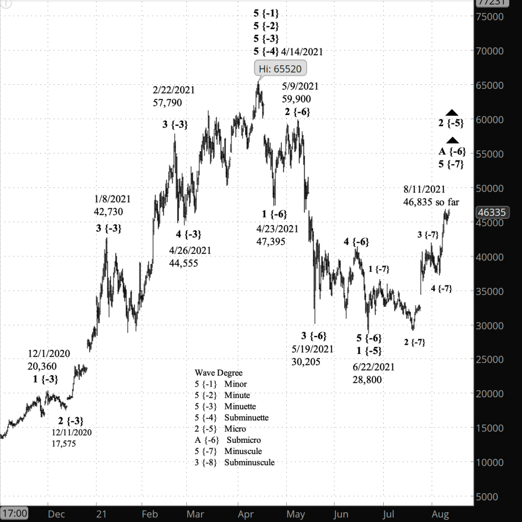 At this point under the rules of Elliott wave analysis, there is no way to say which scenario the market will follow. Since Bitcoin allows for bull trades only, my plan is to trade the Micro degree. Using the principle analysis labelling, I’ll sit out the internal 5th wave of Micro wave A, and the decline of Micro wave B. From the B-wave low, I’ll re-enter my positions and ride Micro wave C to a new high. The same plan works for the alternative analysis, but with different labels.