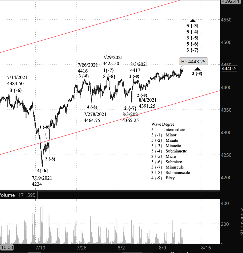 What’s happening now? The S&P 500 E-mini futures rose as the opening bell approached, reaching a high of 4443.25 so far today. The high on the index so far is 4449.32.