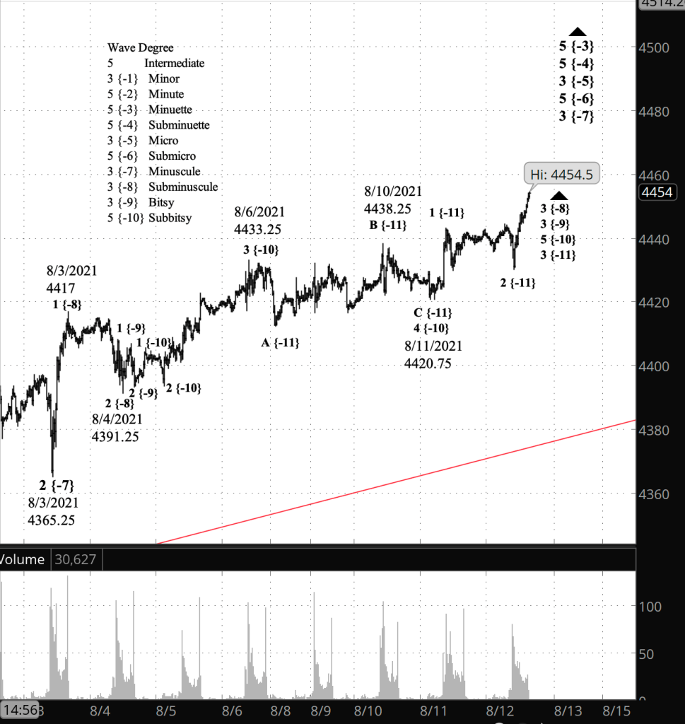 What does it mean? The rise that began August 4 from 4391.25 continues. It is a small part of the end game of a far larger move that began on February 23, 2020 from 2191.86.