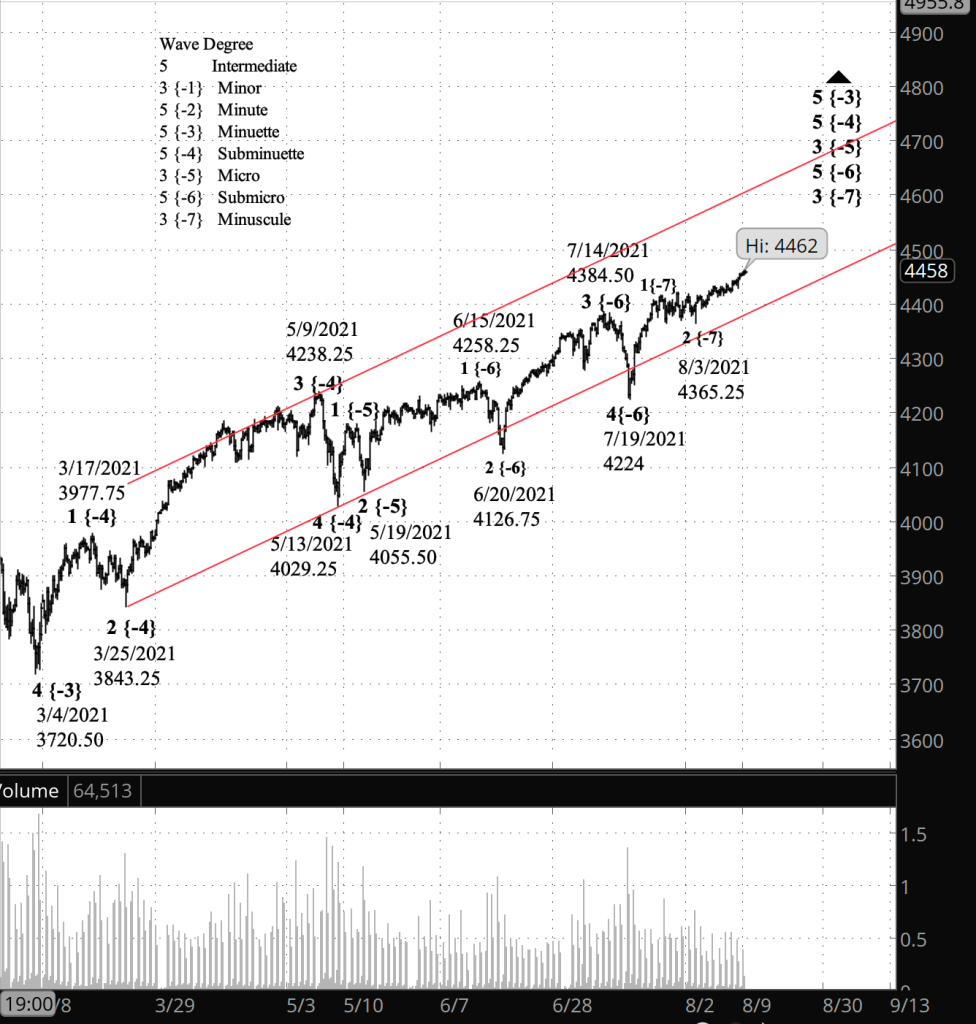 Today’s high so far is about a third of the way up the distance from the lower boundary to the upper. So Minuette wave 5, which began on May 13 from 4029.25, still has some distance to go. The uptrend that began on Aug. 3 from 4365.25 is wave 3 of Minuscule degree, four degrees down from the Minuette degree that forms the basis for channel. That difference in degree gives plenty of room for the price to rise at a normal pace — it doesn’t require an extraordinary burst of energy to reach the upper boundary. So I expect business as usual, if that phrase has any meaning when applied to the markets.