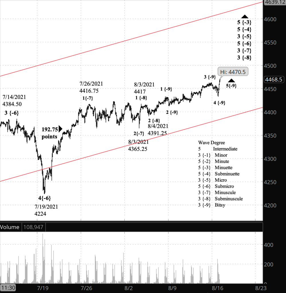 One little gotcha to look out for: Under the rules of Elliott wave analysis, a 3rd wave can’t be the short of the three odd-numbered waves in a trend. Since Minuscule wave 1 is 192.75 points long, Minuscule 3 would to exceed 4558 to be longer than wave 1. My experience has been that the 3rd wave is almost always the longest of the three. If Minuscule 3 falls short of 4558, then the following 5th wave would have to be shorter than wave 3 in order to be in compliance with the rules. If the 5th wave is longer, then it would require a complete recount within Submicro wave 5.
