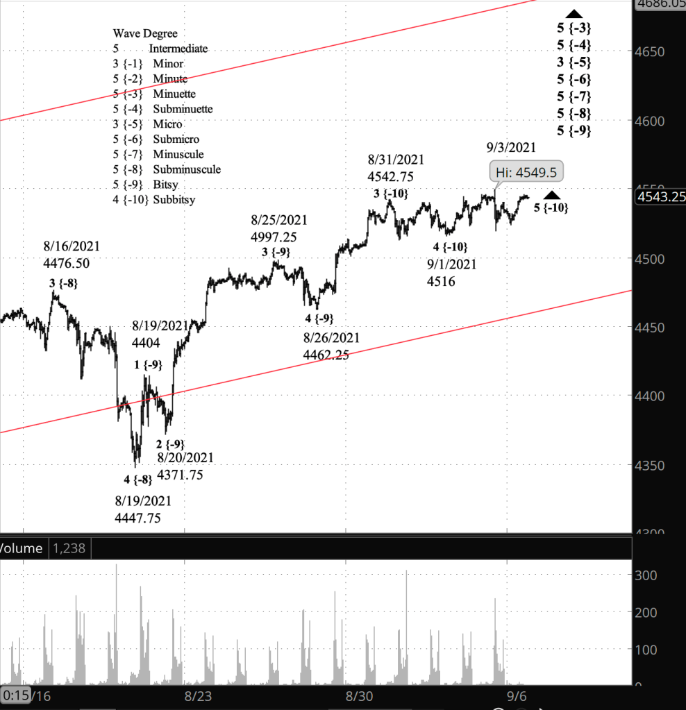 What does it mean? The price is in the very early stages of the middle portion of the rise that began on September 1, following the end of of a two-day correction. A rise above Friday’s high, 4549.50, will confirm this scenario.
