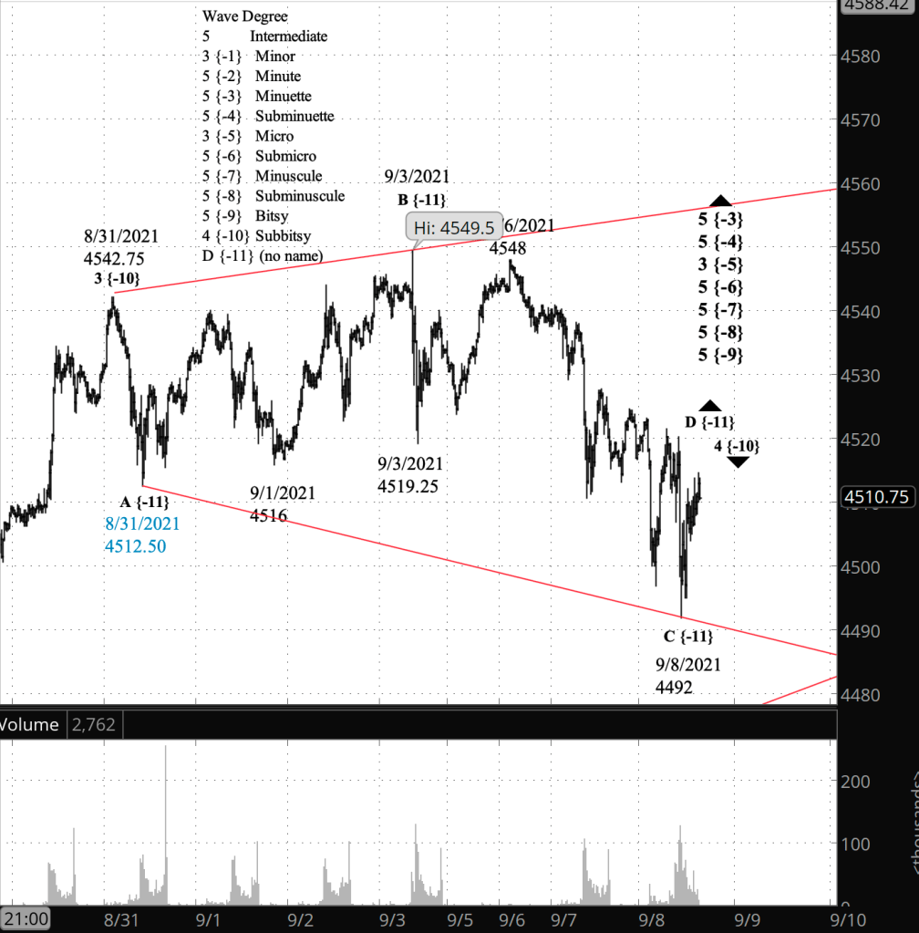 Under my alternative analysis, wave C {-11} is still underway, as is its parent wave, the 4th of Subbitsy degree. This analysis will come into play if the price declines below 4497 — the overnight low — before reaching the region of the expanding triangle’s upper boundary.