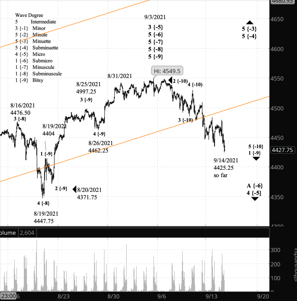 A price rise above the September 3 peak, 4549.50 on the futures and 4545.85 on the index, would mean that the alternate count is correct: wave 3 of Micro degree is not yet complete. Such an event would invalidate my present principal analysis and would promote the alternate count to principal count.