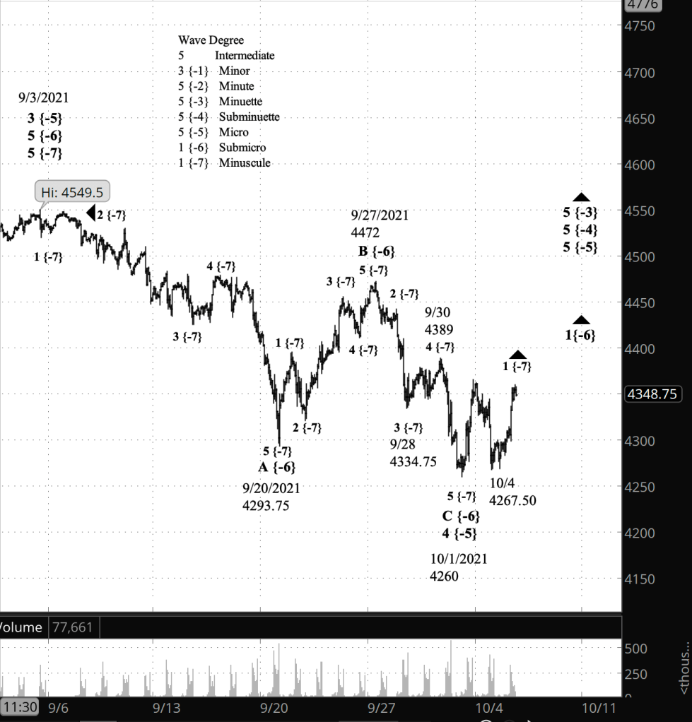 The higher the price goes, the more likely the principle analysis is corrective. If the price reverses and falls bellow the October 1 low of 4260, then the alternate scenario becomes the most likely.