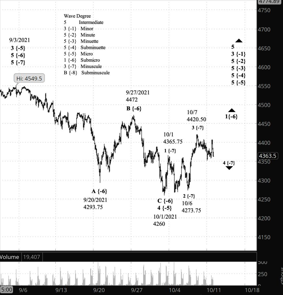 The pattern is happening within wave 5 of Micro degree, which began on October 1. The 5th wave will eventually move above the preceding 3rd wave, which ended on September 3 at 4549.50, and the move could carry the price significantly above that level.