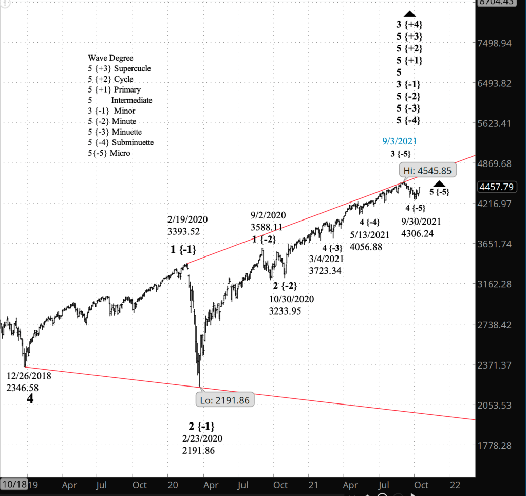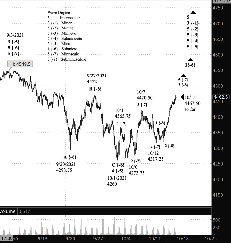 Wave 1 of Submicro degree is the first of five waves. First waves tend to be a bit tentative, as though traders aren’t quite able to believe that an uptrend is underway. It is followed by 2nd wave correction that reclaims much of the 1st wave’s rise, and then by an energetic 3rd wave. It is that 3rd wave, in my opinion, that will be likely to break above the September 1 peak of 4545.85 on the index, 4549.50 on the futures.