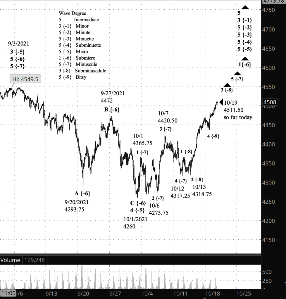 What does it mean? The rise that began yesterday is the final leg of a rise that began October 13, which in turn is the middle leg of a rise that began October 12. That middle leg will be followed by a decline that may carry the price back down to the low 4300s. Long story short: More rising prices in the S&P 500’s near future, punctuated by at least one correction that will startle the market..