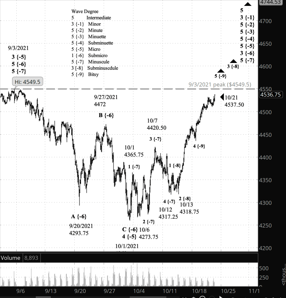 What does Elliott wave theory say? The rise from October 1 is wave 5 of Minuscule degree within wave 3 of Submicro degree. Within Minuscule 5, from larger to smaller, the price is tracing wave 3 of Subminuscule degree, its child wave 5 of Bitsy degree, and — unlabelled on the chart — its grandchild, wave 5 of Subbitsy degree. I’m less certain of the Subbitsy count, and indeed, yesterday’s high may in fact be the end of Subitsy 5, Bitsy 5 and Subminuscule 3, and the beginnging of the 4th wave of Subminusule degree, a shallow correction.