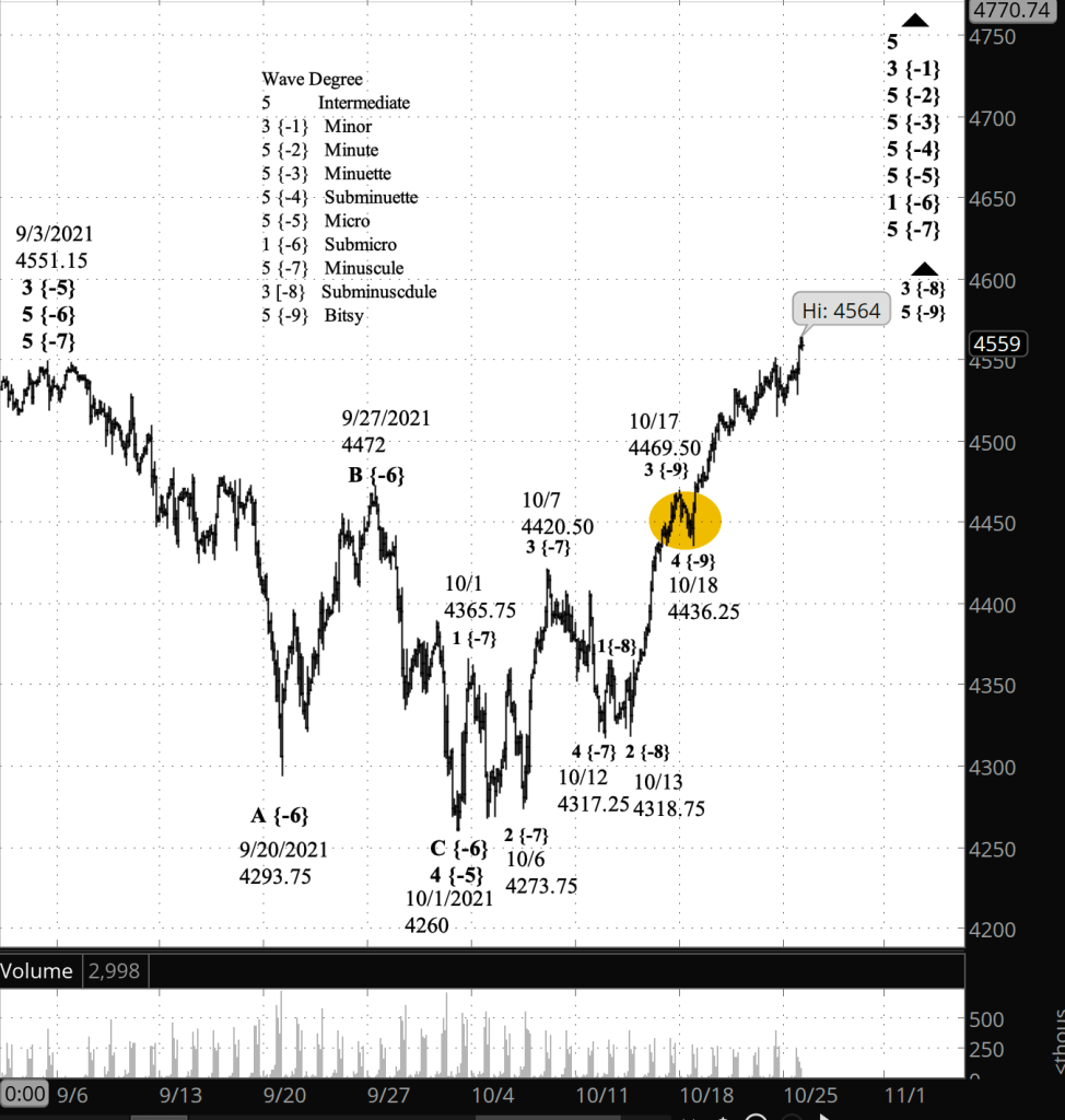 In this case, that’s wave 4 of Bitsy degree within wave 3 of Subminuscule degree, which I’ve marked on the chart with a circle. Bitsy wave 4 within the 3rd wave ranges from 4469.50 down to 4436.25, suggesting that the present correction, wave 4 of Subminuscule degree, has 100 points of downside potential, more or less,