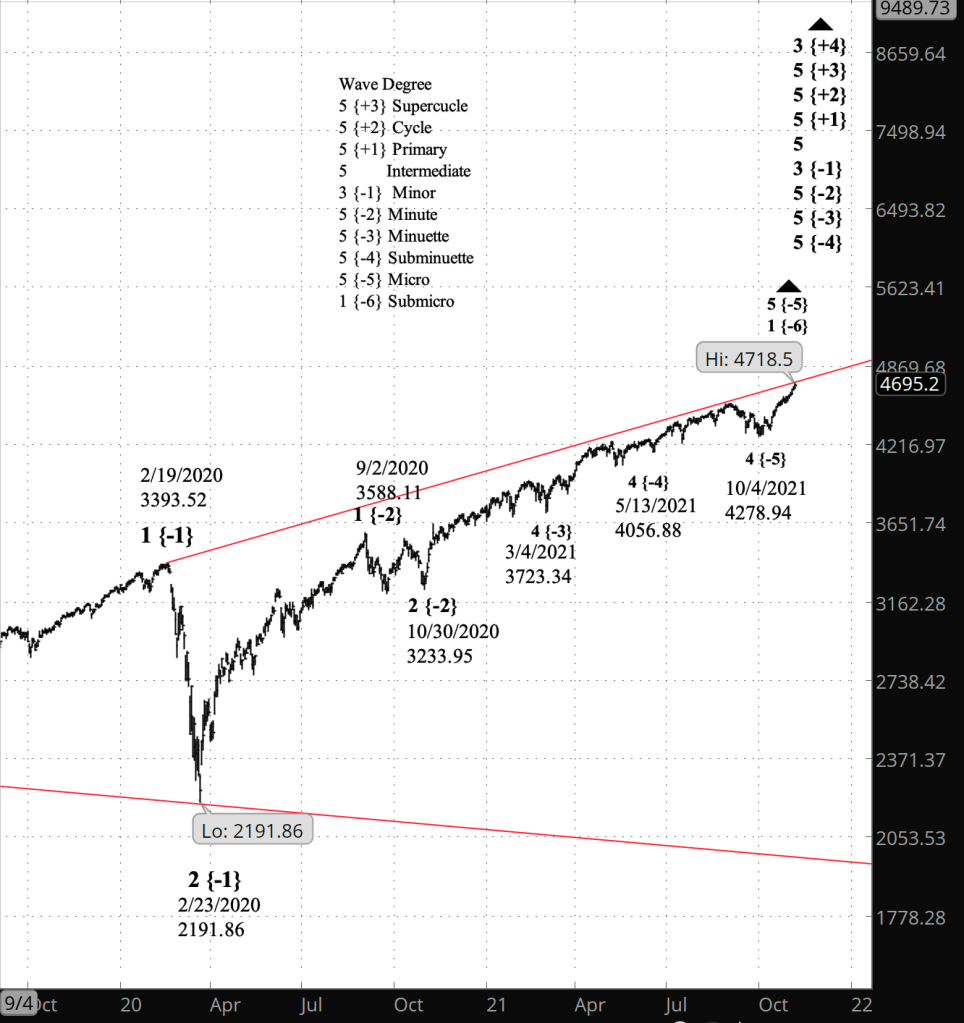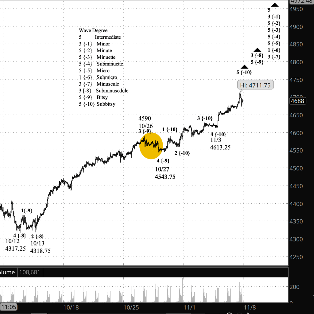 So how long should I wait? If today’s peak is in fact the end of of the rise from October 27 — wave 5 of Bitsy, it is also the end of wave 3 of the parent wave of Subminuscule degree. So the subsequent correction will be wave 4 of Subinuscule degree, probably a Flat, and it is likely to end within the price range of wave 4 of Bitsy degree within wave 3 of Minuscule degree. That Bitsy wave 4 declined from 4590 to 4543.75 (marked on the chart with a tan oval). And so if the price reaches the low 4600s, then I’ll be inclined to label the present wave as wave 4 of Subminuscule degree. That target range is something that often happens with 4th waves, but it’s not a rule, so the decline could be shallower or deeper. Which will make chart analysis decisions “interesting” over the next few days.