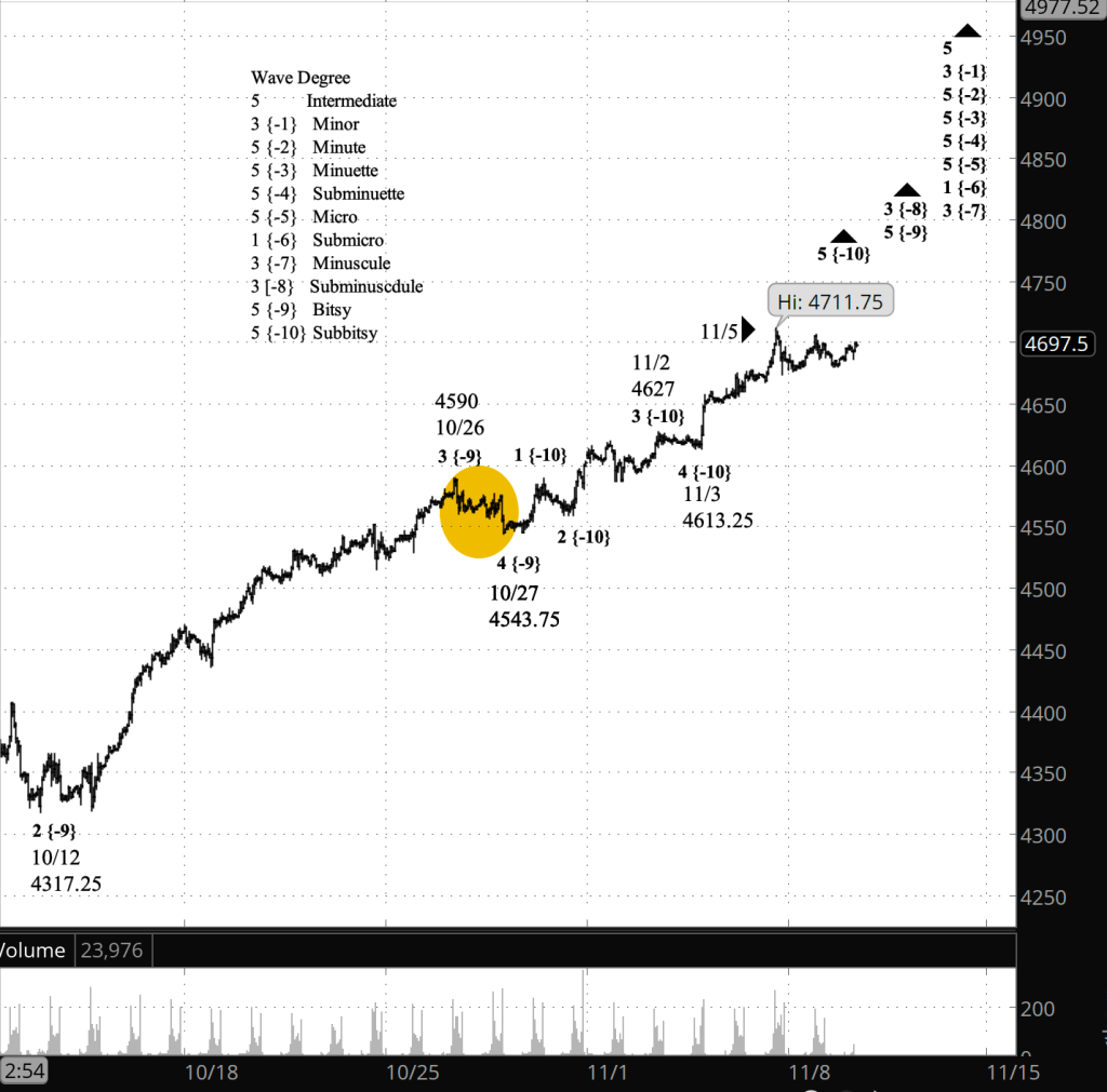 What I’ve marked after November 5 as waves 1 , 2 and 3 with a {-10} subscript, indicating Subbitsy degree, may well be a or two below Subbitsy. The chart will gain clarity as the post-November 5 decline develops.
