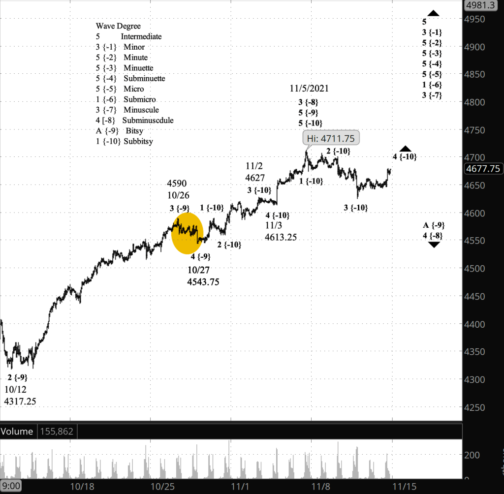 What does Elliott wave theory say? The low-level upward correction is wave 4 of Subbitsy degree — subscript {-10} — within wave A of Bitsy degree (-9} within the larger wave 4 of Subminuscule degree {-8}, a downward correction that began from the November 5 peak. (I use the subscripts for degree-labelling on the charts.)