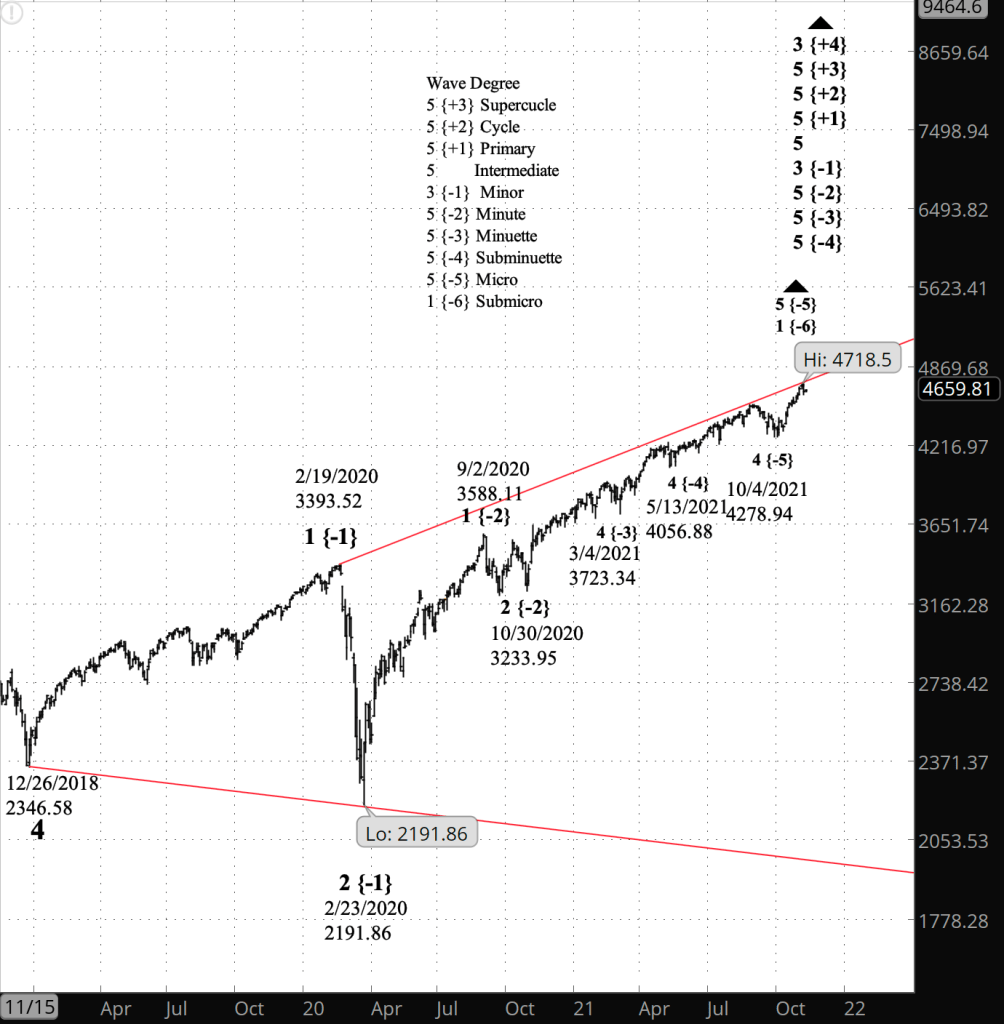 Fourth waves tend to be shallow, and the S&P 500’s present positioning is a 4th wave correction (Subbitsy) within a 4th wave correction (Subminuscule). All of that is happening within a rising 3rd wave of Minuscule degree {-7} within a 1st wave of Submicro degree {-8}, and going higher, within a series of 5th waves all the way up to wave 5 of Minute degree {-2}, which is within wave 3 of Minor degree {-1} within wave 5 of Intermediate degree (no subscript). The entire rise from the low of the early pandemic crash on February 23, 2020 is wave 3 of Minor degree.