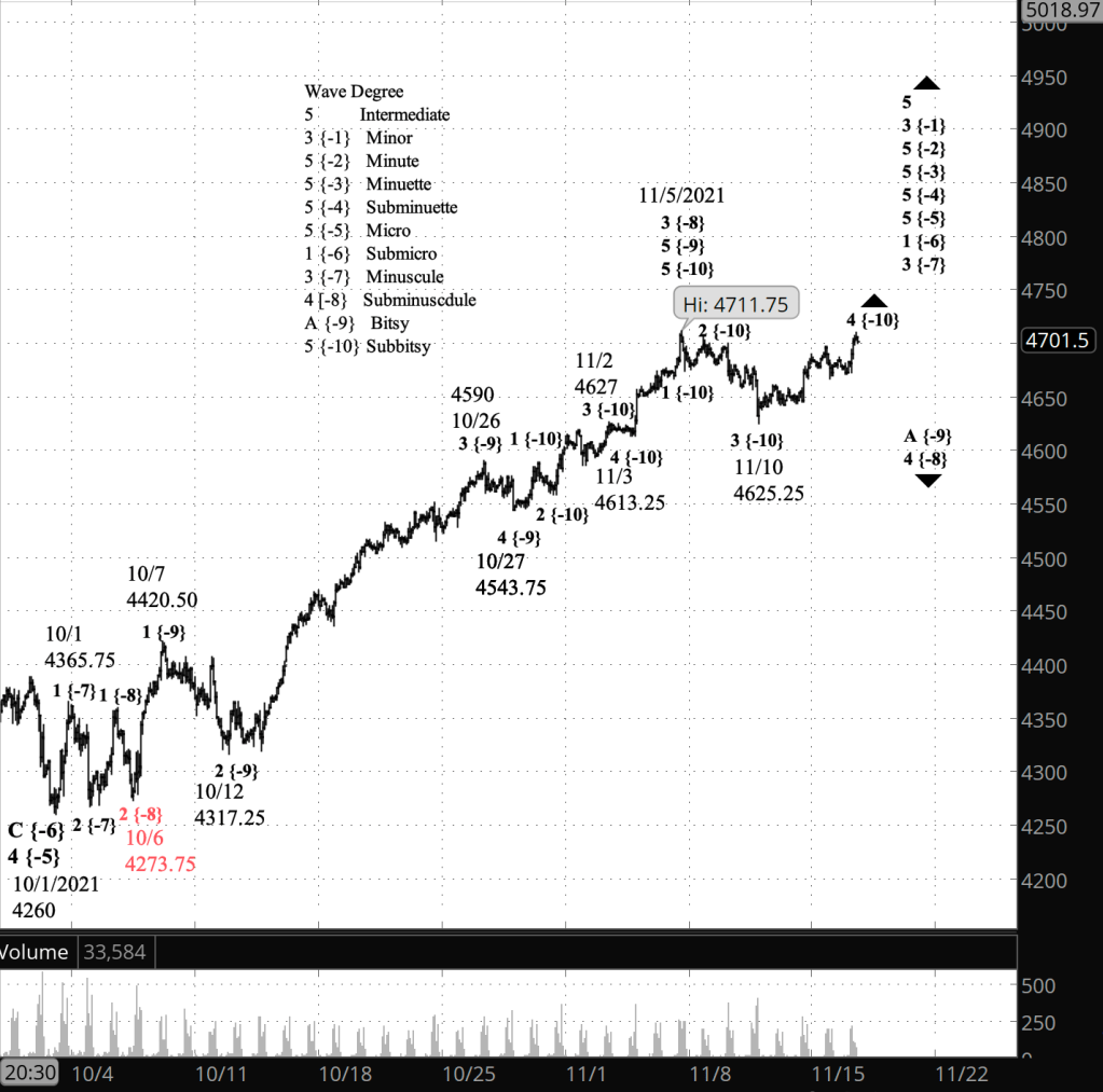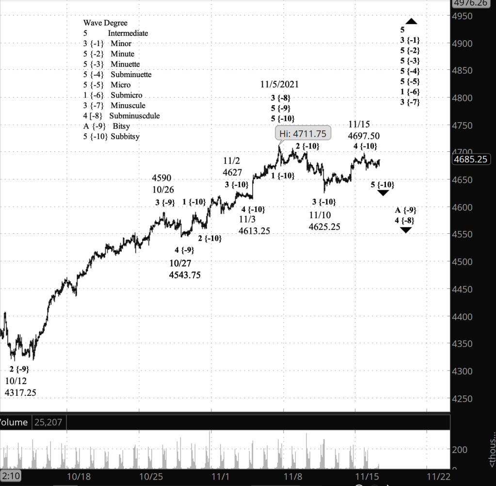 What does Elliott wave theory say? Under my principal analysis, the sideways movement is an early stage of wave 5 of Subbitsy degree — a {-10} subscript on the chart — which is the final, declining portion of wave A of Bitsy degree {-9} within a wave 4 correction of Subminuscule degree {-8}. Bitsy wave A will be followed by a rising B wave that may again reach into the 4690s, and then by declining C wave that will complete Subminuscule wave 4. That 4th wave will be followed by Subminuscule wave 5, which will push above the November 5 peak to new heights.