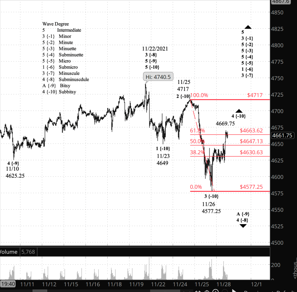 Half an hour before the closing bell. The S&P 500 has risen during the day to 4669.75 so far on the futures, 4672.95 on the index, a price level slightly above a 61.8% retracement of the preceding decline that began on November 25. In Elliott wave terms, wave 4 of Subbitsy degree {-10} continued to rise. Internally, it is in its C wave (the 3rd and final wave in both a Flat and a Zigzag pattern). No change in the analysis. I’ve updated the chart.