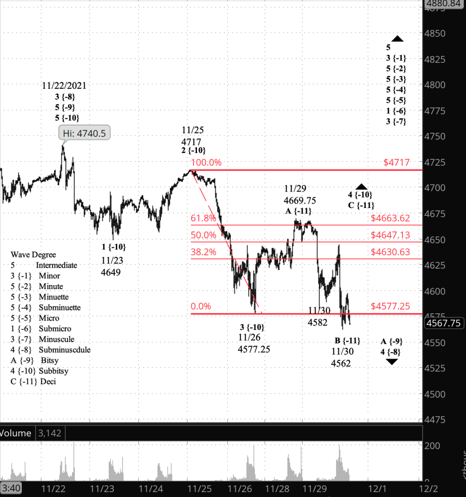 Half an hour before the closing bell. The futures completed a small rise from today’s low and then retreated slightly, staying above the low point, 4562. No change in the analysis at this point. A drop below 4562 would most likely indicate that wave B was still underway, although it would trigger a critical look at the entire structure of the decline that began on November 25. I’ve updated the chart.