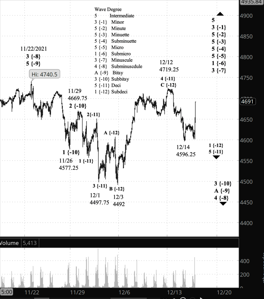 What does Elliott wave theory say? Under my principal analysis, the decline that began on December 12 is wave 1 of Subdeci degree — subscript {-12} — within wave 5 of Deci degree {-11} within wave 3 of Subbitsy degree {-10}. The whole structure is part of a larger correction, standing within wave A of Bitsy degree {-9} within wave 4 of Subminuscule degree {-8}, a downward correction that began on November 22.