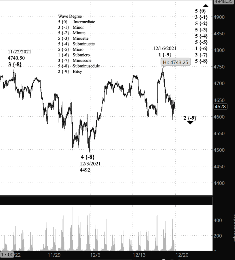 Under my principal analysis, wave 2 of Bitsy degree — subscript {-9} — is underway and appears to be close to completing its first internal wave, A of Subbitsy degree {-10}. The structure is part of wave 5 of Subminuscule degree {-8}, which began on December 3.