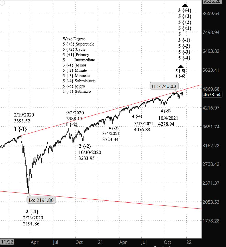 Charts. The upper chart is a close-up view beginning in late November. The lower chart is a long view, beginning in November 2019; it shows the early pandemic crash, and the redlines are the boundaries of an expanding Diagonal Triangle that began in December 2018.