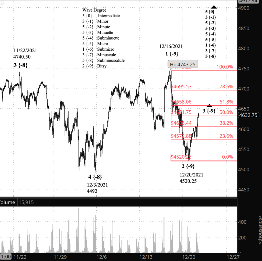 Half an hour before the closing bell. The S&P 500 rose during the trading session, reaching the 50% retracement level as the closing bell approached. Uptrending wave 5 of Bitsy degree {-9} continues.