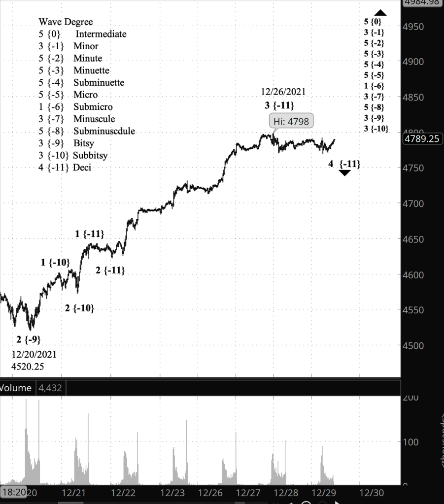 What does Elliott wave theory say? The correction is wave 4 of Deci degree — subscript {-11} within wave 3 of Subbitsy degree {-10} within wave 3 of Bitsy degree {-9}, which began on December 20. All of this is happening within rising wave 5 of Subminuscule degree{-8}, which began on December 3 from 4492.