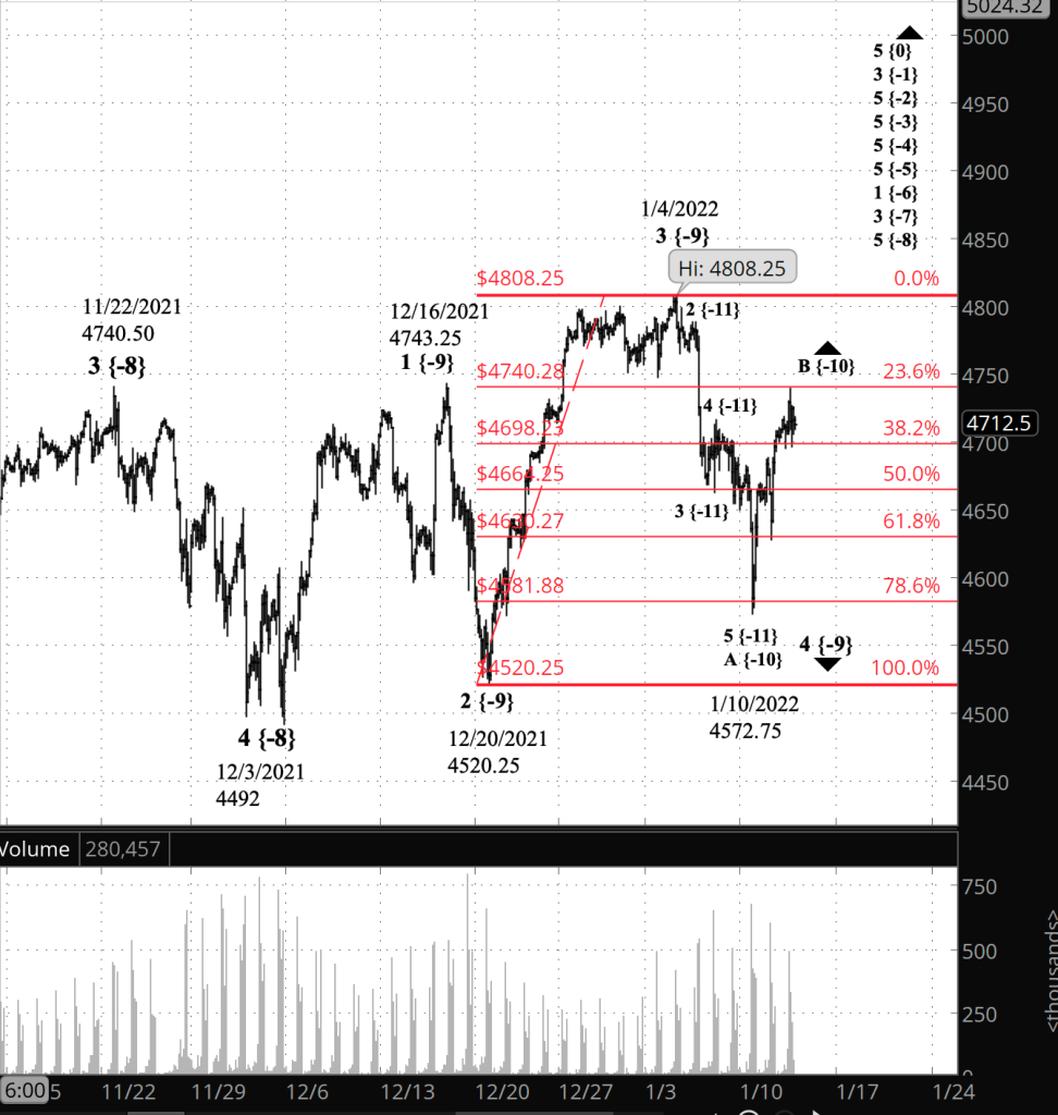 Half an hour before the closing bell. The S&P 500 rose to the 23.6% Fibonacci retracement level and then pulled back slightly. The movement was the third wave within wave B{-10} and fulfilled all requirements for completion of the B wave. The price could go higher, but under my principal analysis, can’t go above 4808.25, the January 4 peak. No change in the analysis from this morning, beyond the correction noted below. I’ve updated the chart.