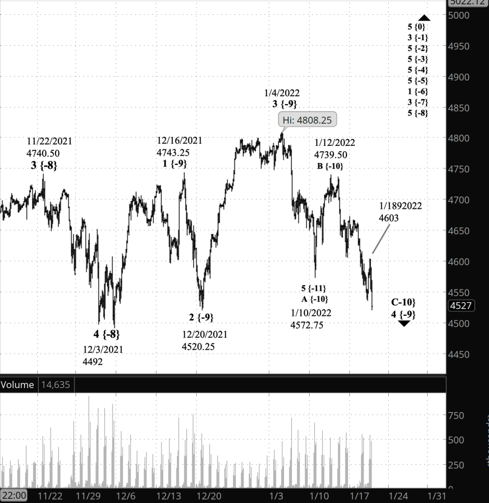 At the close. The S&P 500 futures declined further in the final minutes of the trading session, reaching a low of 4521.25 as the closing bell sounded. The price moved lower that yesterday’s reversal point, 4535.50, refuting my principal analysis and validating the first alternative: The overnight rise is a low-level rise within the larger, ongoing downward correction. The present decline is the 5th wave within wave C{-10} within the wave 4{-9} downward correction. I’ve updated the chart.