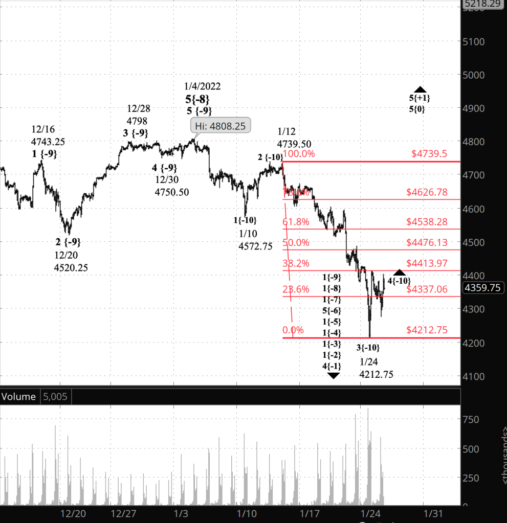 What does Elliott wave theory say? Under my principal analysis, wave 3{-10} within wave 1{-9} ended on January 24, at 4512.75, and the present rise is the early stage of wave 4{-10}. All of this is happening within wave 1{-8} a larger downtrend that began on January 4, the end of wave 5{-8} at 4808.25. Under the rules of Elliott wave analysis, 4th waves never move beyond the end of the preceding wave 1, which in this case ended on January 10 at 4572.75, slightly above the 61.8% retracement level. Given the tendency of corrections to fit within the structure of Fibonacci retracement levels, an upside target of 4538 — the 61.8% retracement — would be a reasonable expectation for the 4th wave’s ending point.
