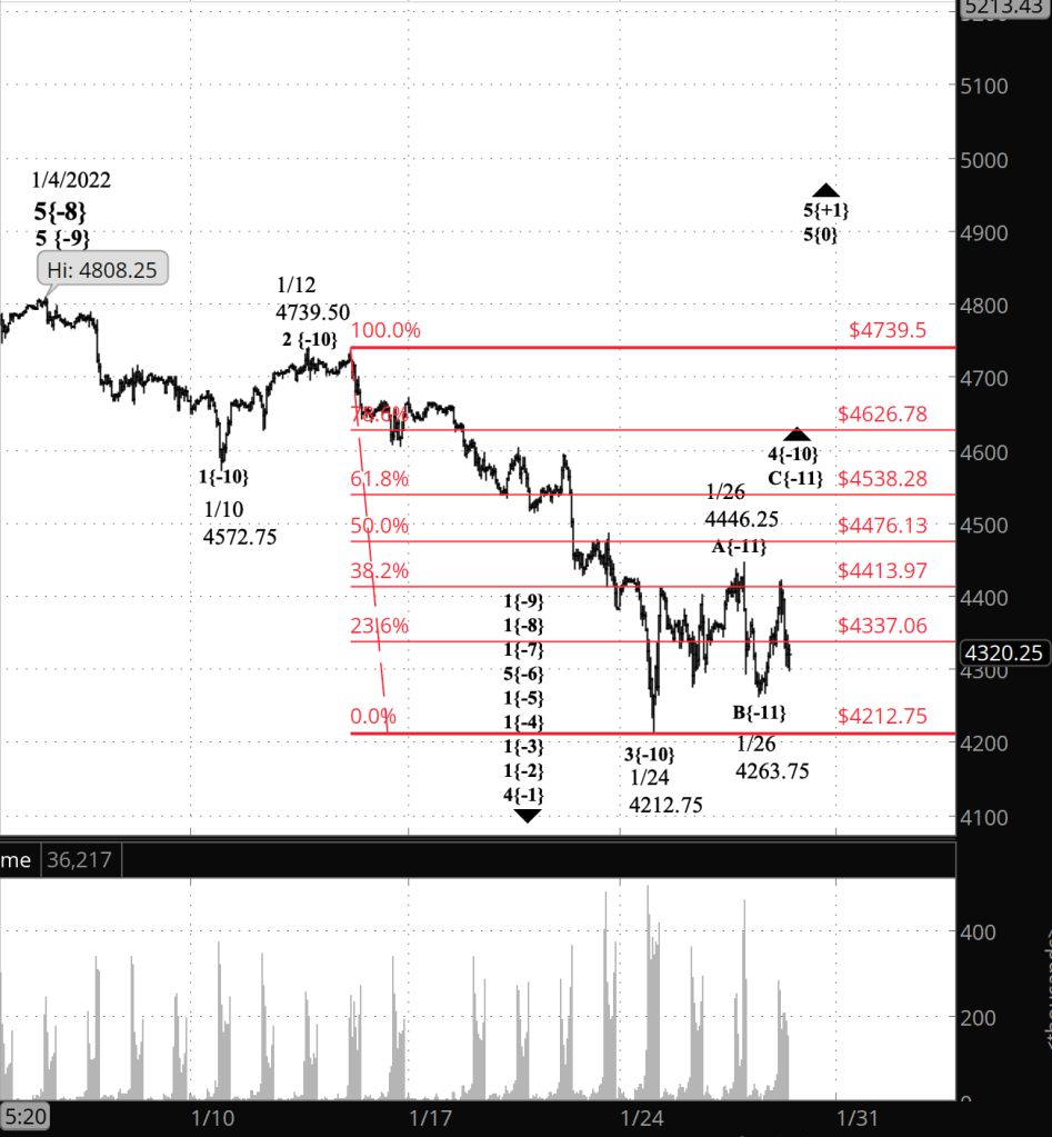 Half an hour before the closing bell. The S&P 500 futures spent much of the day at or below the 23.6% Fibonacci retracement level. Wave C{-11} within an upward correction, wave 4{-10} appears to still be underway. However, the first alternative — wave B{-11} is still underway — deserves consideration as long as the price is stalled well below the January 26 peak, 4446.25. No change in the analysis. I’ve updated the chart.