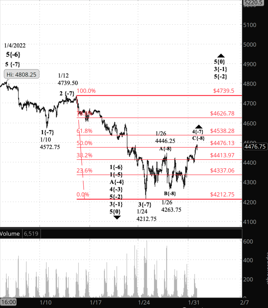 The end of wave 4{-7} will be followed by a resumption of the downtrend that began on January 4 from 4808.25. Wave 5{-7} will stretch below 4212.75, perhaps significantly so. It’s end will also mark the end of its parent wave 1{-6}, which also began on January 4.