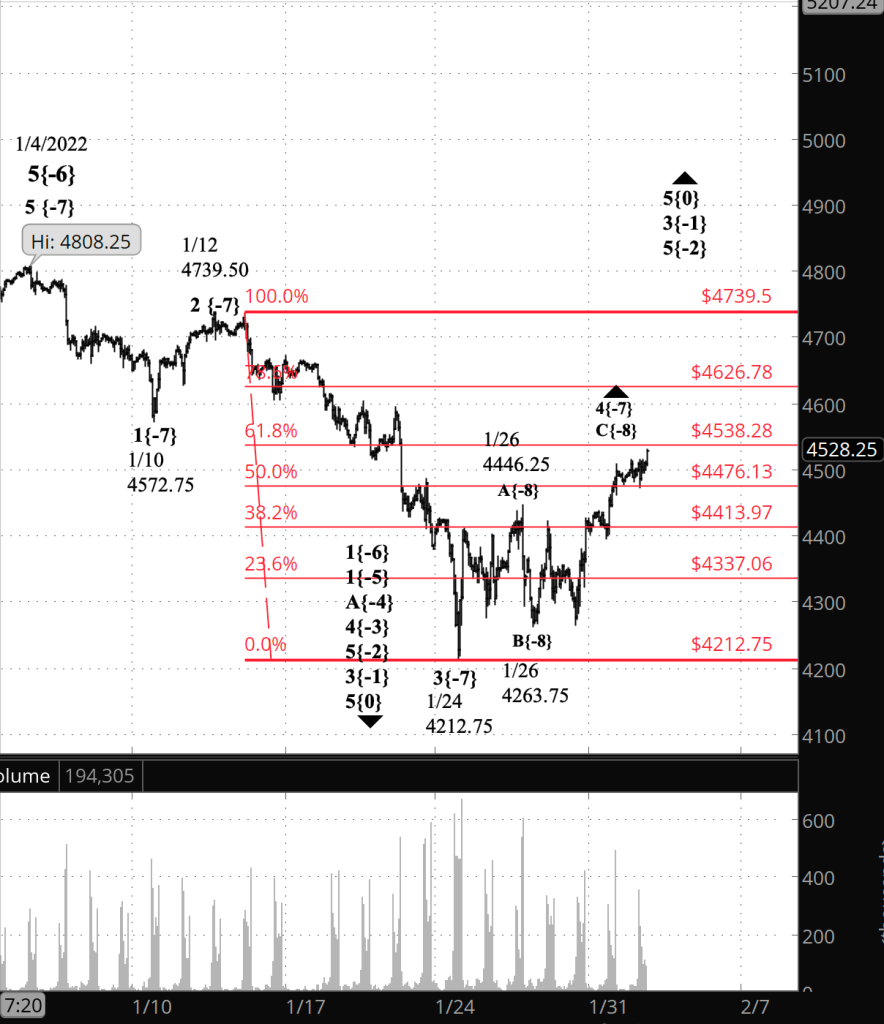 What does Elliott wave theory say? Wave 5{-9} within rising wave C{-8} is underway, as the parent wave 4{-7} nears it’s end. Under the rules of Elliott wave analysis, a rising 4th wave must remain below the end of the preceding 1st wave. Wave 1{-7} ended on January 10 at 4572.75. Wave 5{-9} has almost reached its end but could rise a bit more, perhaps to the 61.8% retracement level, 4538.28, which is 35 points below the end of wave 1{-7} and so is within the rules.