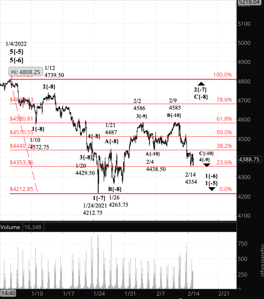 The larger correction is wave 2{-7}, which began January 24 from 4212.75, and internally, it is within its final leg, wave C{-8}, whose end will mark a resumption of the downtrend that began on January 4, wave 3{-7}, a powerful wave that almost certainly will carry the price below 4212.75, the end of the preceding 1st wave.