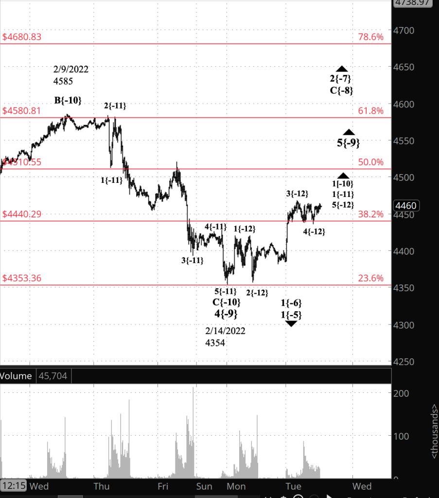 The structure within wave 5{-9} is consistent with an uptrend. From the smaller wave degree to the larger, the current fractal positioning is wave 4{-12} to the downside within a series of rising waves, beginning with wave 1{-11} within wave 1{-10} within wave wave 5{-9}, all of which began February 14 from 4354.