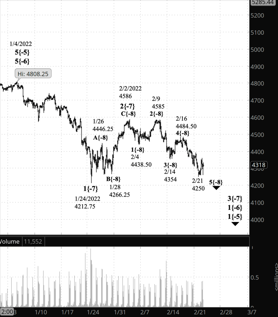 Prior to Monday evening, my principal analysis had wave 4{-9} underway, a downward compound correction that began on February 2. Under the Elliott rules, 4th waves can’t move beyond the end of the preceding 1st wave, which was at 4266.25. When the price moved below that level Monday evening, I re-analyzed the chart to bring it back into conformance withe the rules of Elliott wave analysis. The only way to do that was to count the correction — wave 2{-7} — as having ended on February 2, and the downtrend to have resumed, as wave 3{-7}, on that date.