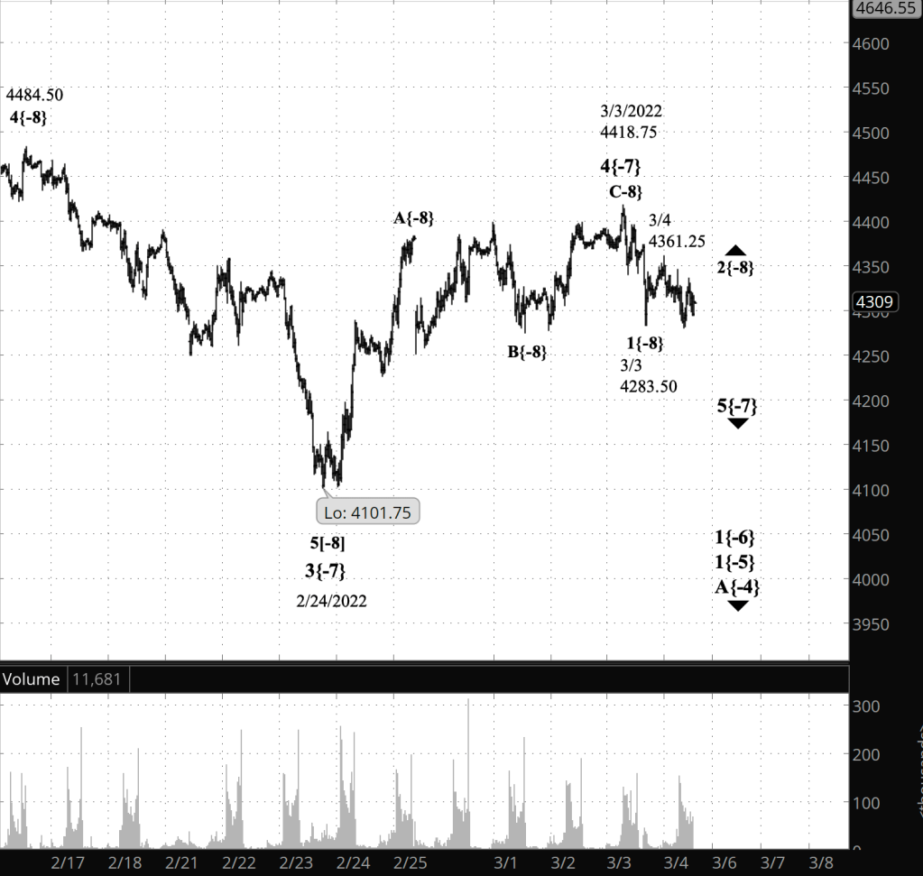 Half an hour before the closing bell. The S&P 500 futures fell from the overnight high, 4361.25, to low of 4281.25 during the day and then rose a bit. Wave 2{-8}, an upward correction, is underway and internally is in either its B (middle) wave to the downside or has started its C (final) wave to the upside. All of this is happening within downtrending wave 5{-7} within downtrending wave 1{-6}. I’ve updated the chart.
