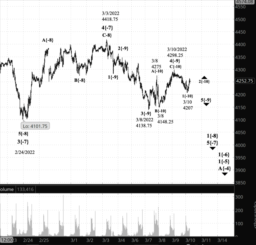 Half an hour before the closing bell. The S&P 500 futures fell to 4207 during the first two hours of the session, and then reversed to the upside. By my principal count, the decline was wave 1{-10} within downtrending wave 5{-9}. The rise that followed is wave 2{-10}. Second waves tend to take a Zigzag pattern, which means three subwaves labeled A, B and C. The A wave has five subwaves within it; the B, three; and the C, five.