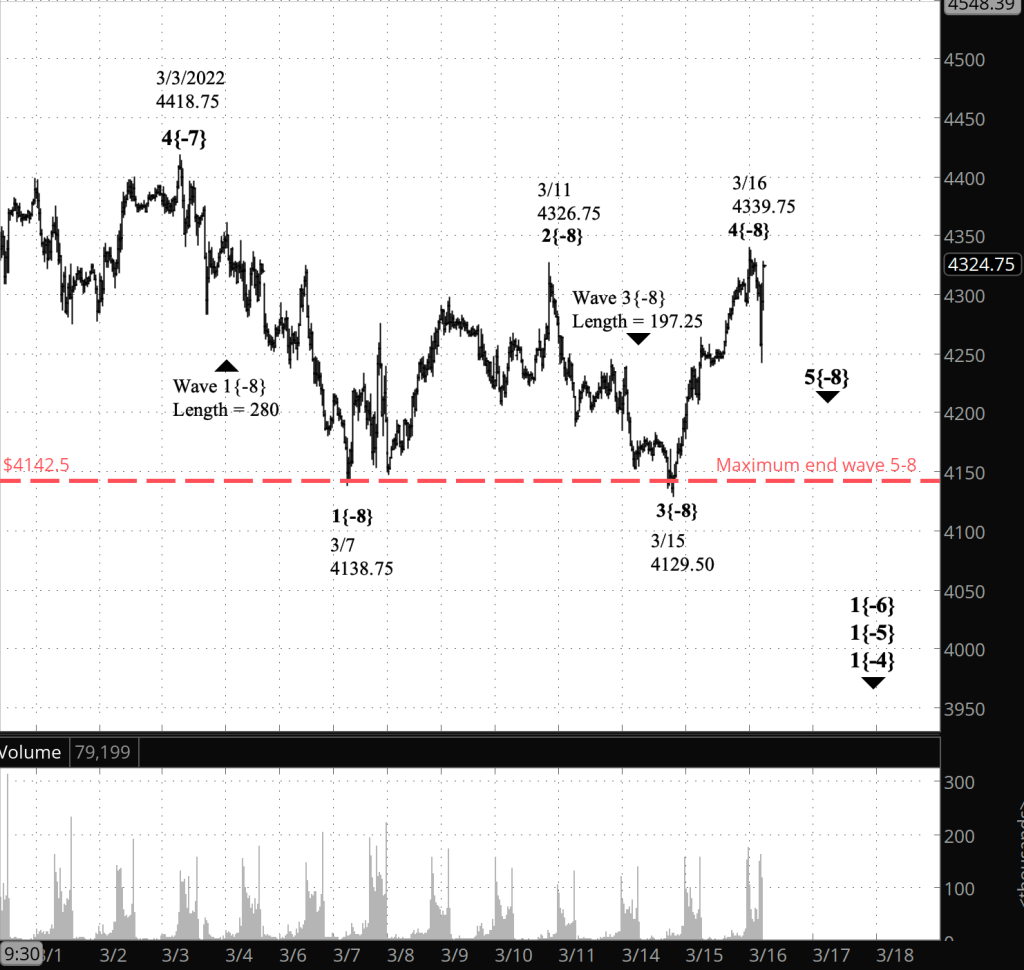 If the price rises above 4326.75, the end of wave 2{-8}, then it becomes increasingly possible that wave 2{-8}, an upward correction, is in fact still underway, with the March 11 peak being the end of wave A{-9}, the March 15 low the end of wave B{-9}, and wave C{-9} to the upside being currently underway. But it’s not a certainty. The rules of Elliott wave analysis don’t prohibit a 3rd wave from being beyond the start of preceding wave 3.