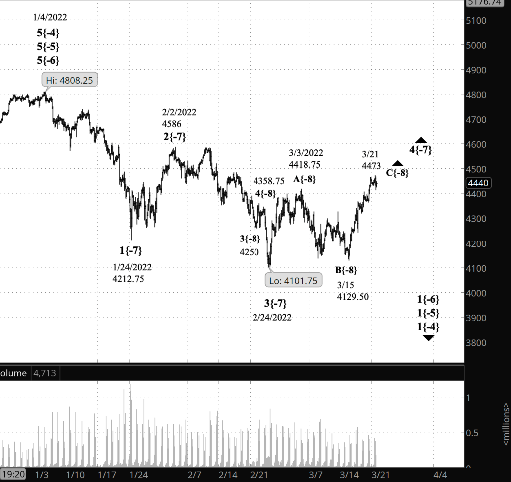 Half an hour before the closing bell. The S&P 500 peaked shortly after the opening bell, at 4473 on the futures, and then declined slightly. The upward correction, wave 4{-7} has taken the form of a Flat, and within that form, wave C will have five waves within it. Wave C{-8} is in its fifth wave internally, wave 5{-9}. It’s very short so far, which is allowed under the rules of Elliott wave analysis — a truncated 5th. So today’s high could be the end of wave C{-8} and its parent, wave 4{-7}. But not necessarily. The lower the price falls, the more likely it is that the upward correction has ended and 5{-7} to the downside has begun.