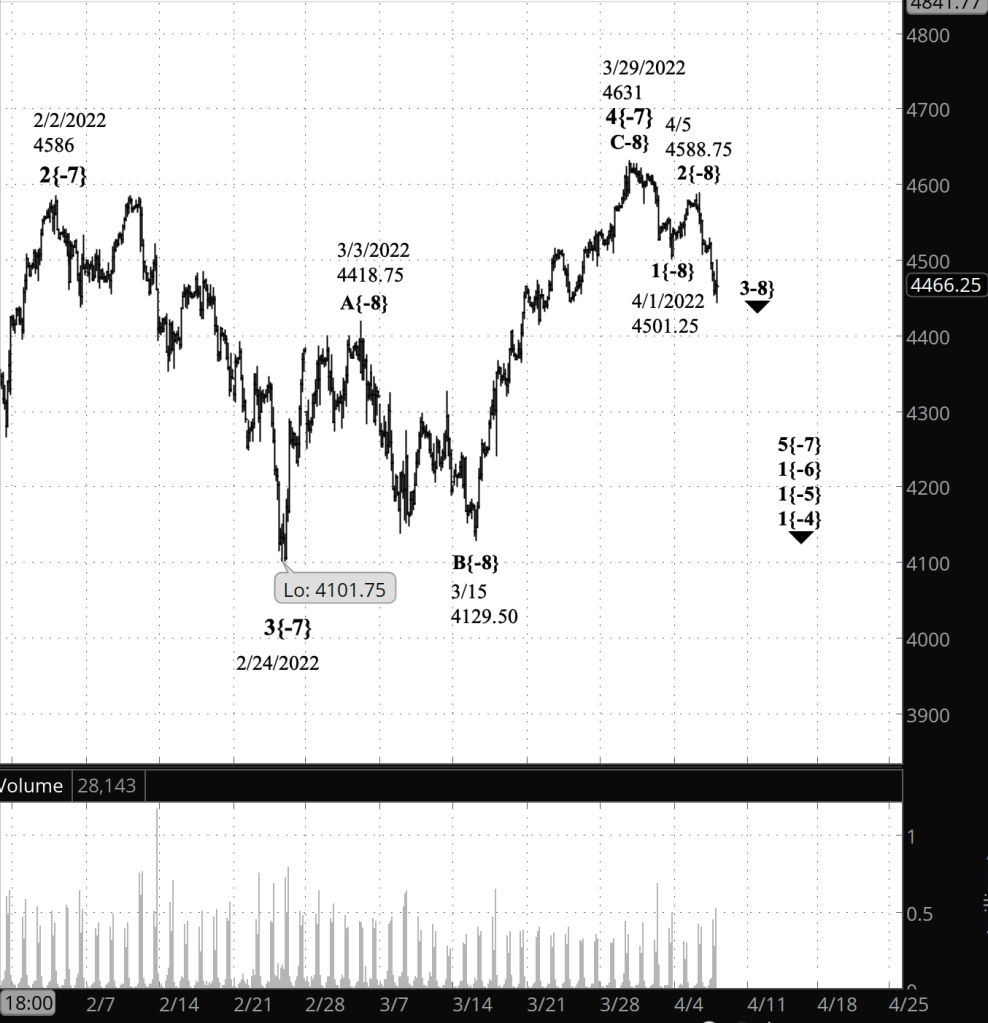What does Elliott wave theory say? The correction that ended on April 5 at 4588.75 was wave 2{-8}. Yesterday’s analysis considered that peak to be the end of wave A{-9} within wave 2{-8} and the decline that followed to be wave B{-9}. However, when the price fell below the starting point of the preceding 1st wave — 4501.25 — it had done something that no 2nd wave can do under the rules discovered by R.N. Elliott. When a wave breaks a rule in Elliott wave analysis, it doesn’t mean the wave is a rule-breaker. It means the analysis no longer matches the reality on the chart. And such is the case here. The fall below the start of wave 1{-8} can only mean that wave 2{-8} ended on April 5, and the decline that followed is wave 3{-8}.