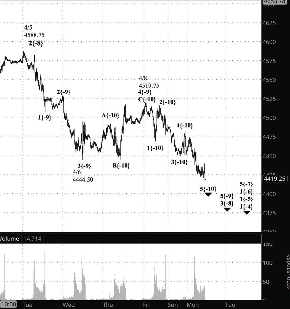The decline below 4444.50, the end of wave 3{-9} on April 6, confirms this morning’s principal analysis, that the upward correction, wave 4{-9} ended on April 8, and wave 5{-9} is now underway.