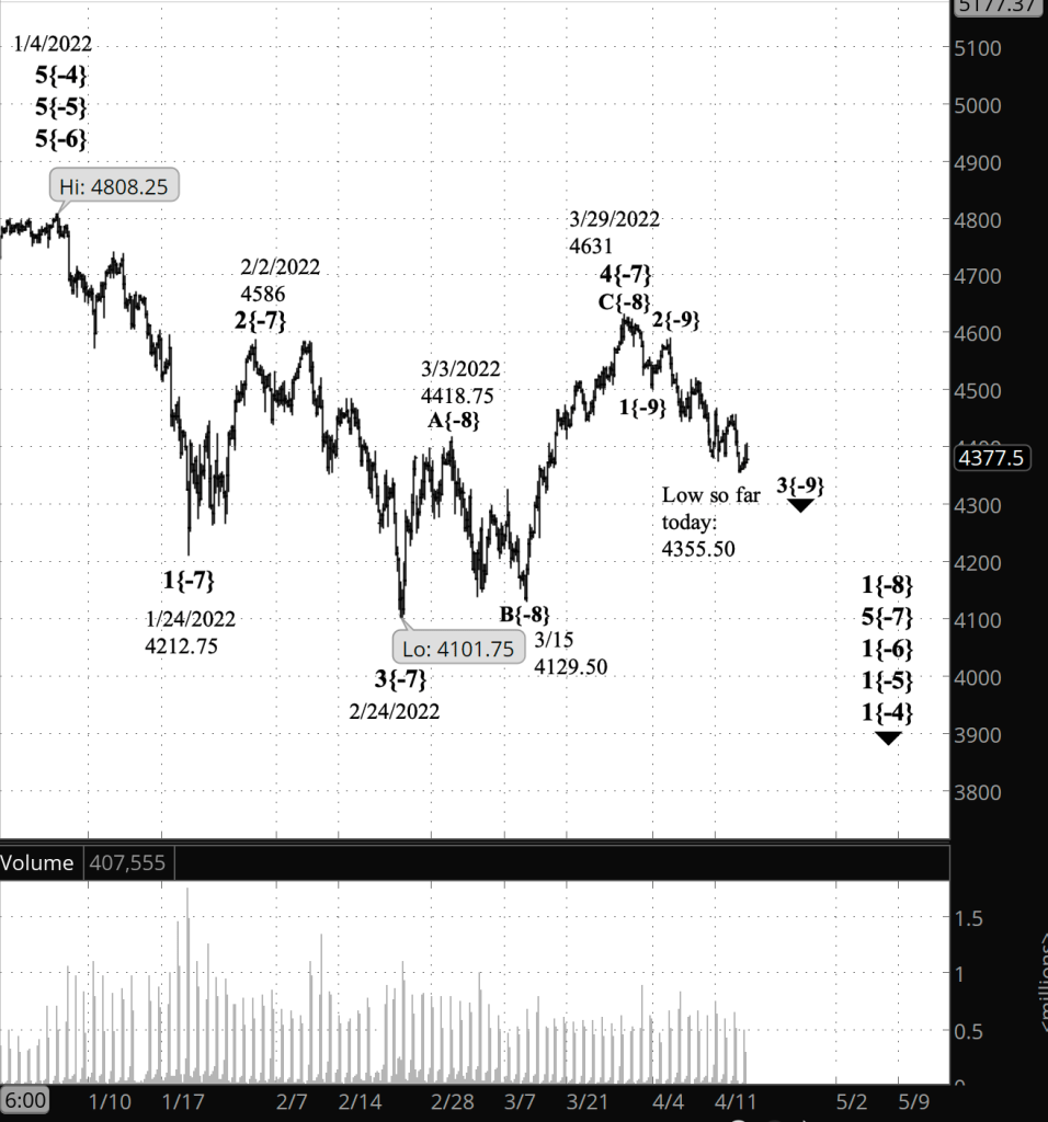 Wave 3{-9} will be followed by a small upward correction, wave 4{-9}, and then a resumption of the downtrend, wave 5{-9}. The end of wave 5{-9} will also end wave 1{-8}, which began on March 29 from 4631, along with its parent wave, downtrending 5{-7}.