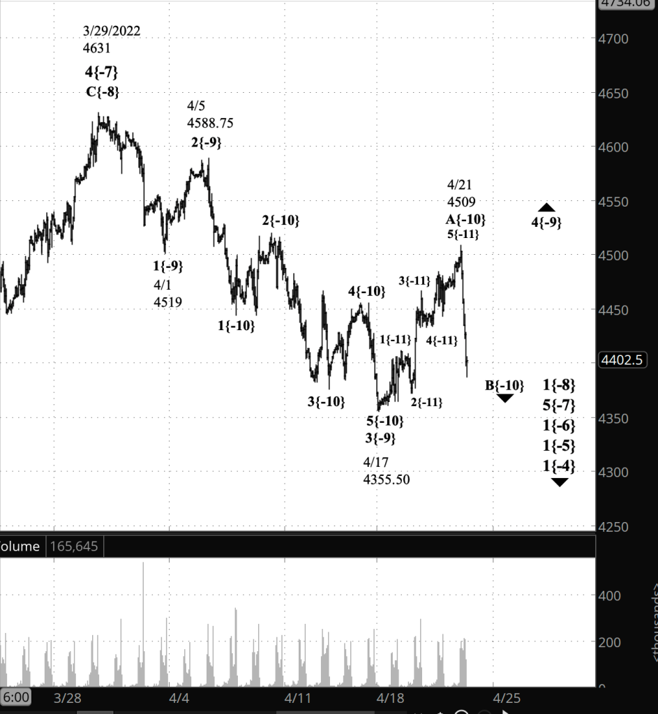 Wave B{-10} will be followed by a C wave that will likely carry the price higher than the end of the preceding A wave, at 4509. But not much higher. A 4th wave never moves beyond the end of the preceding 1st wave — 4519 in this case. If it does, then the chart will demand a re-analysis.