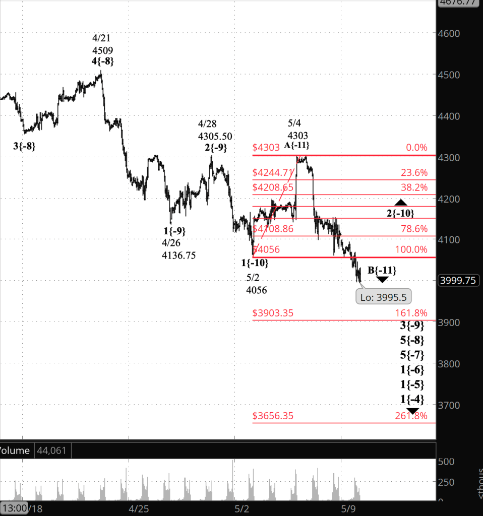 What does Elliott wave theory say? Under my principal analysis, the decline that began on May 4 and that is still underway is wave B{-11} within wave 2{-9}, an upward correction that began on May 2. The B wave’s decline below 4056 , wave 2{-9}’s starting point, suggests that the 2nd wave is taking the form of a Flat rather than a Zigzag, the latter being a more common form for 2nd waves.