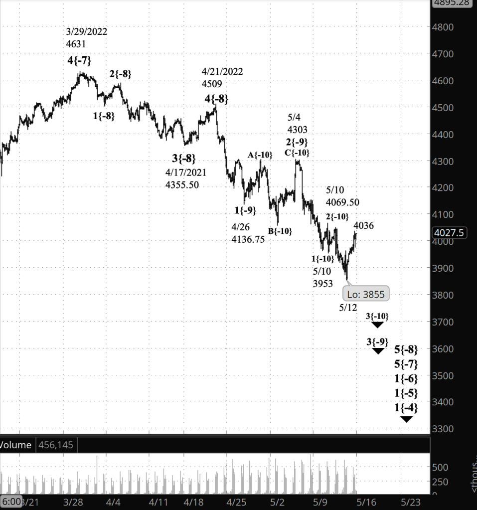 The alternative analysis labels the May 12 low, 3855, as the end of wave 3{-10}. And for the reasons stated above, it’s possible, but in view view, unlikely.