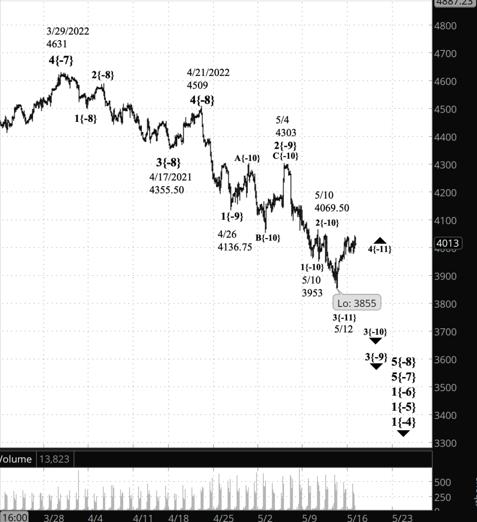 Under the alternative analysis, wave 3{-10} ended on May 10 and the low of May 12 is the end of wave 3{-9}. Under this scenario, the upward correction is wave 4{-9}.