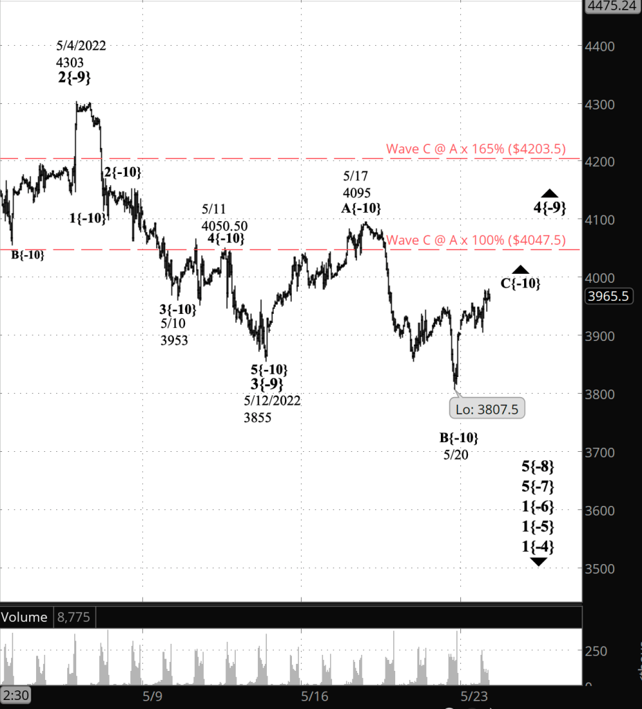 Under Alternative #1, wave B{-10} — the middle wave of its parent wave 4{-9} — is still underway. Friday’s low, 3807.25, was within the target price range, and the pattern can be counted as having three waves internally. Yet the rise and pause after that low could be subwaves of the third subwave within B{-10}.