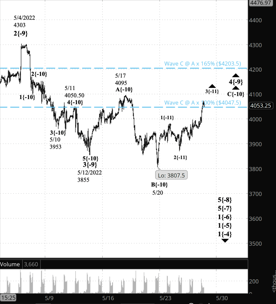Wave C is likely to end within the range marked with blue dashed lines on the chart, between 4047.50 and 4203.50.